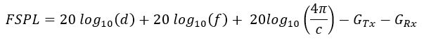FSPL(dB) = 20 × log₁₀(d) + 20 × log₁₀(f) + 92.45 − GTx − GRx